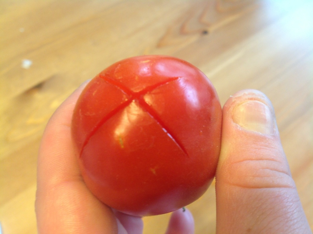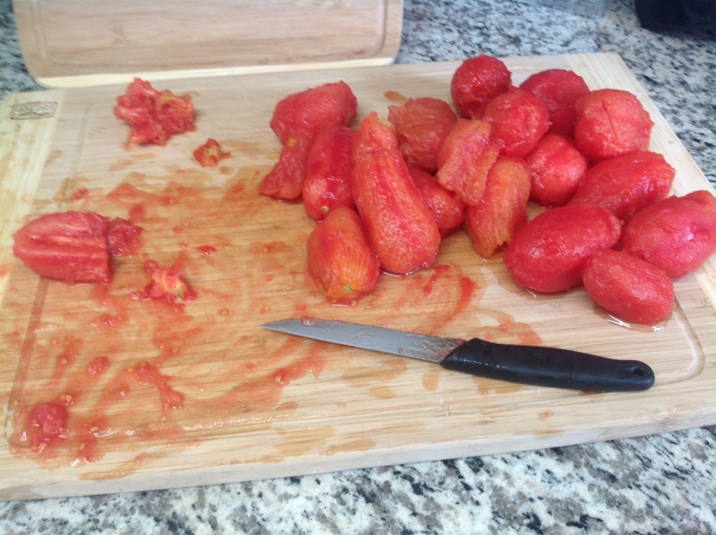 The biggest task for this recipe is to peel and chop the tomatoes. This is exponentially easier if you first blanch them. If you want, cut a small x in the bottom of the tomato.