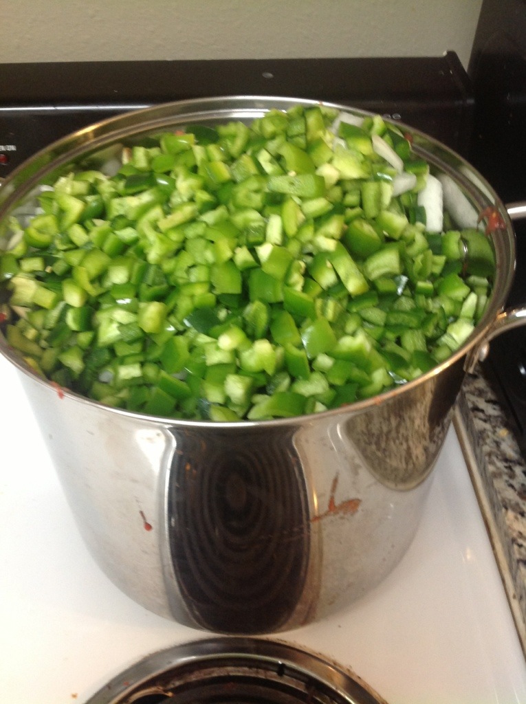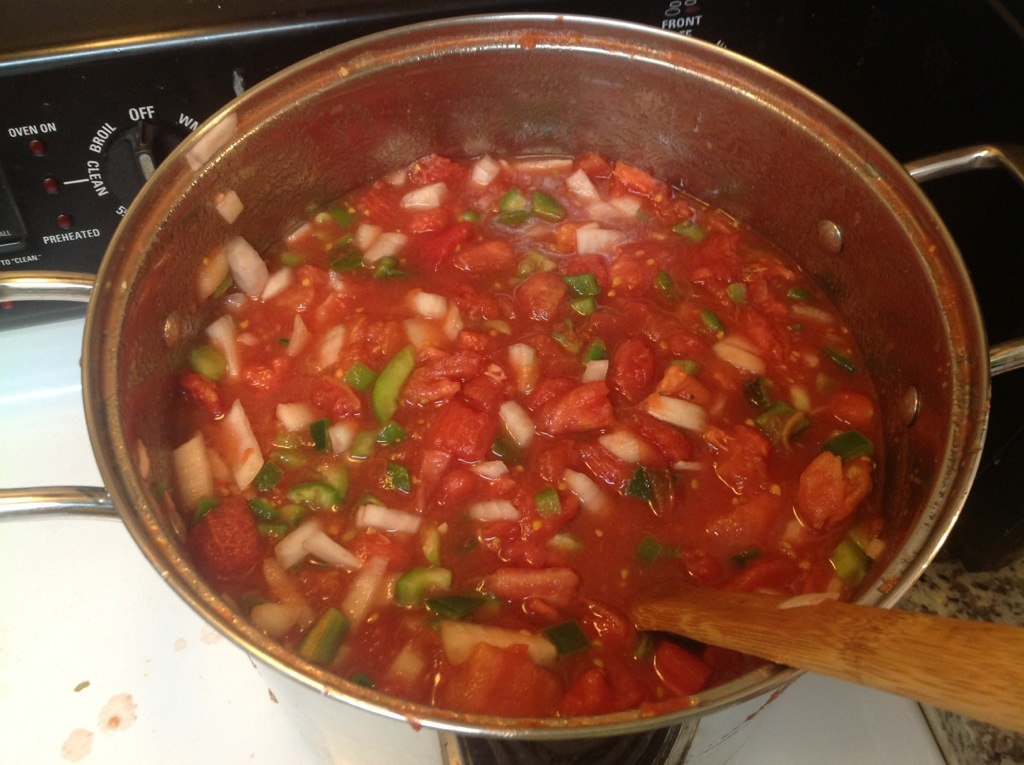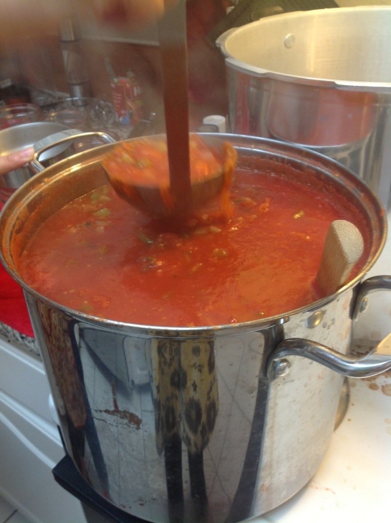 Keeping true with my large batch style of canning, I picked every single red tomato in my garden for this canning session. I have an array of Roma varieties ready and had around 27 pounds when all was said and done. After peeling and chopping we had 33 cups of tomatoes! So we did about 4.7x the recipe as written, which it turns out is pretty much the capacity of my stock pot. To simmer the mixture I actually ended up spreading it out over a couple pots and mixing it all back together at the end.