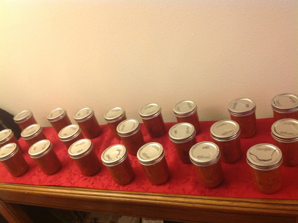 For this giant batch of salsa, we ended up with 22 pints, plus a half pint left over for eats. This took 3 canner loads because only 8 wide mouth pints fit in my canner, so just keep the salsa simmering in between if you do more than one load.