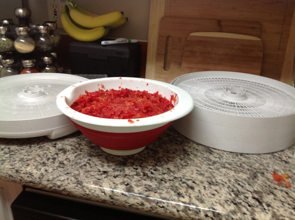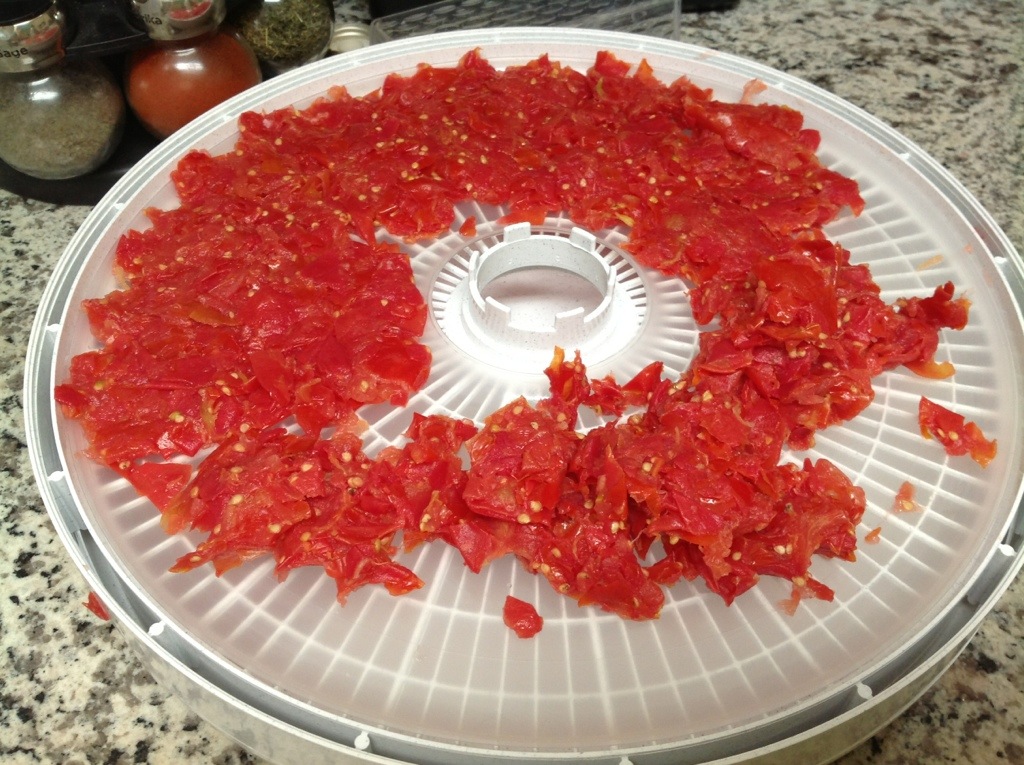 All we really did for this recipe was wring out as much of the excess liquid as we could and place the the skins in a nice even layer on the dehydrator trays. With the skins from 22 pounds of tomatoes we filled two trays. We seasoned it with lots of garlic powder, cayenne, salt and pepper. We turned the dehydrator on to 135 F, and left it overnight.