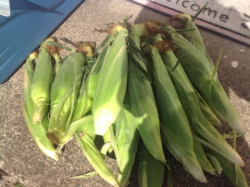 Canning corn is as easy as pie. Step one: husk the corn on the porch.