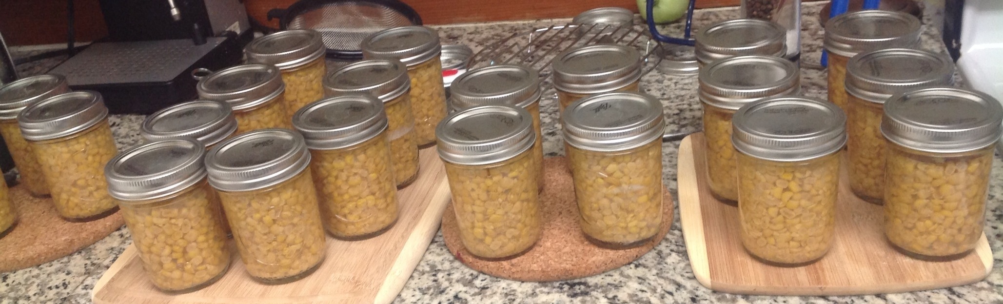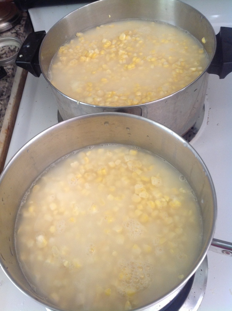 Meanwhile boil a pot of water to use to pour over the corn. Wash the jars and heat them (just leave them full of hot water after you wash them). Then fill the jars with corn (spoon it out with a slotted spoon). Add boiling water to cover the corn leaving an inch head space.