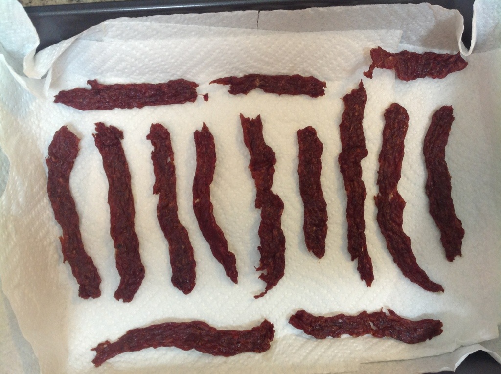 When they are done, remove to a paper towel and leave them for a couple hours wrapped in paper towel if they still have any fat droplets. They shouldn’t really though if you had lean meat. You can tell they are done by removing a piece and letting it cool a bit. Try to bend it in half, and if it won’t break at all it’s not ready. If it splits but doesn’t snap you are probably good to go. You don’t want to cook until it snaps in half, that’s over done. For me with only one pound of beef on 4 trays it took about 5 hours to be satisfactorily done. Don’t overcook it, especially if you still need to do the 10 minutes post drying heating.
