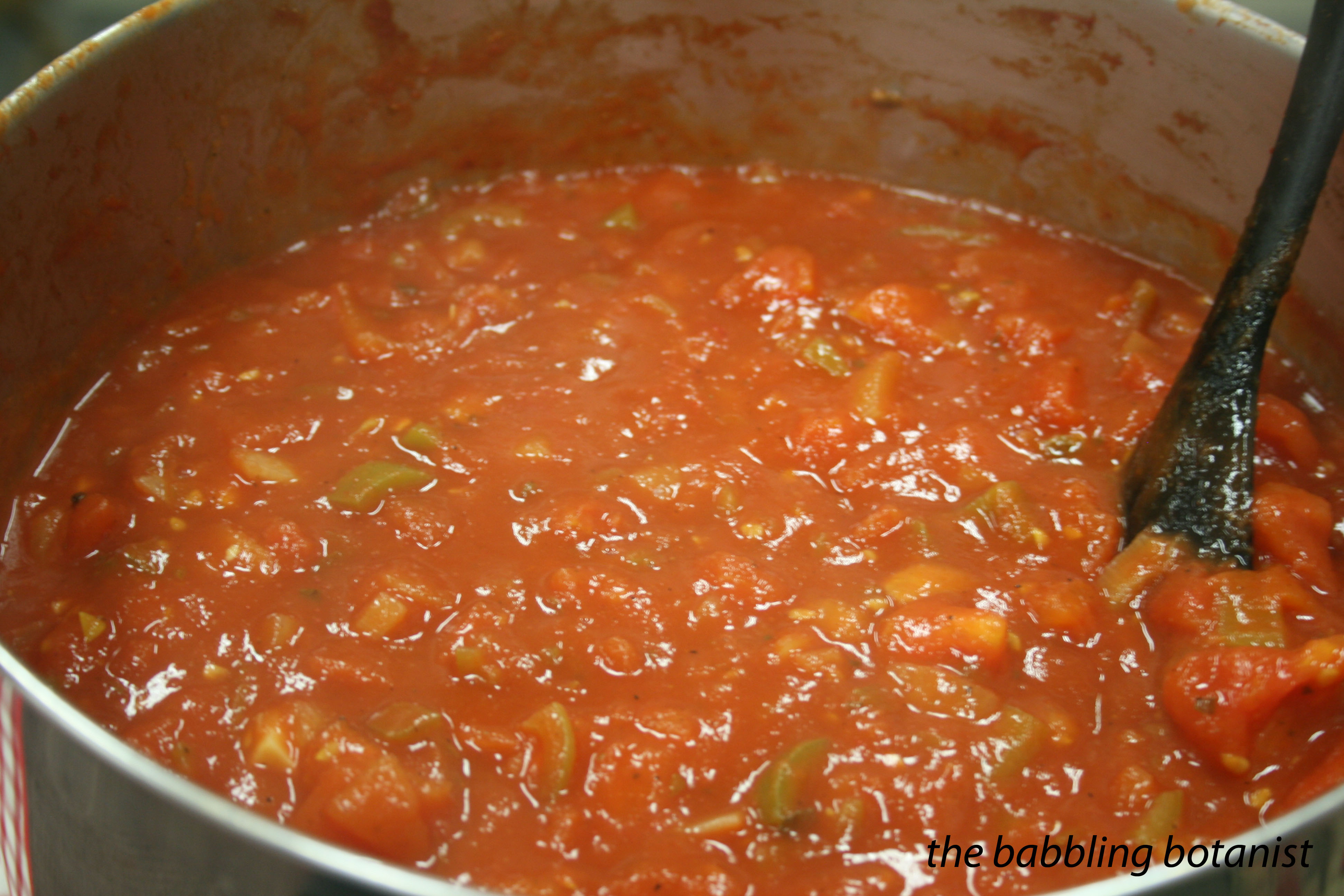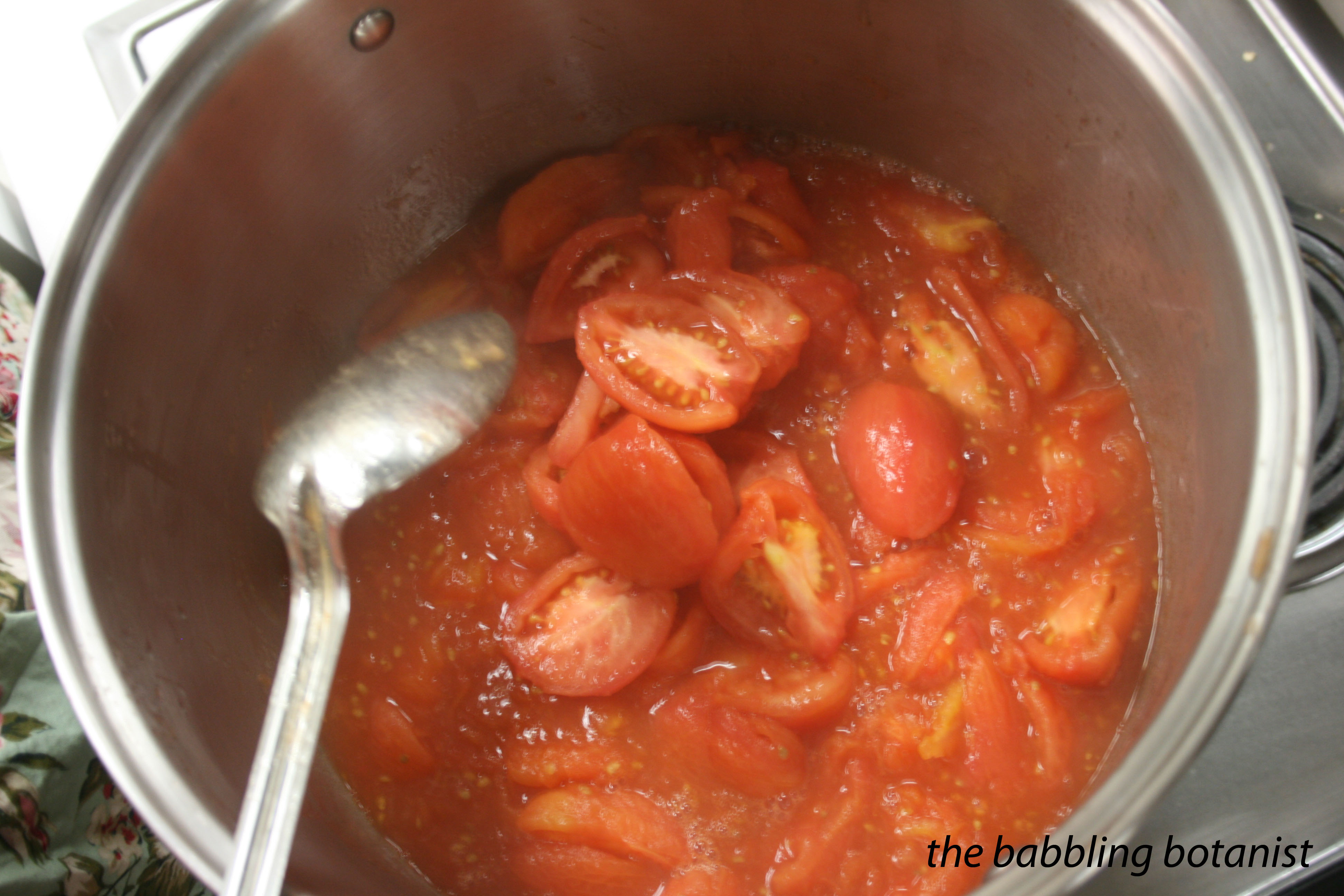 For the crushed tomatoes, we hot packed them. Here we are bringing them to a boil. Hot packing tomatoes is definitely the way to go, or else they have to process for 85 minutes!! That’s crazy talk!
