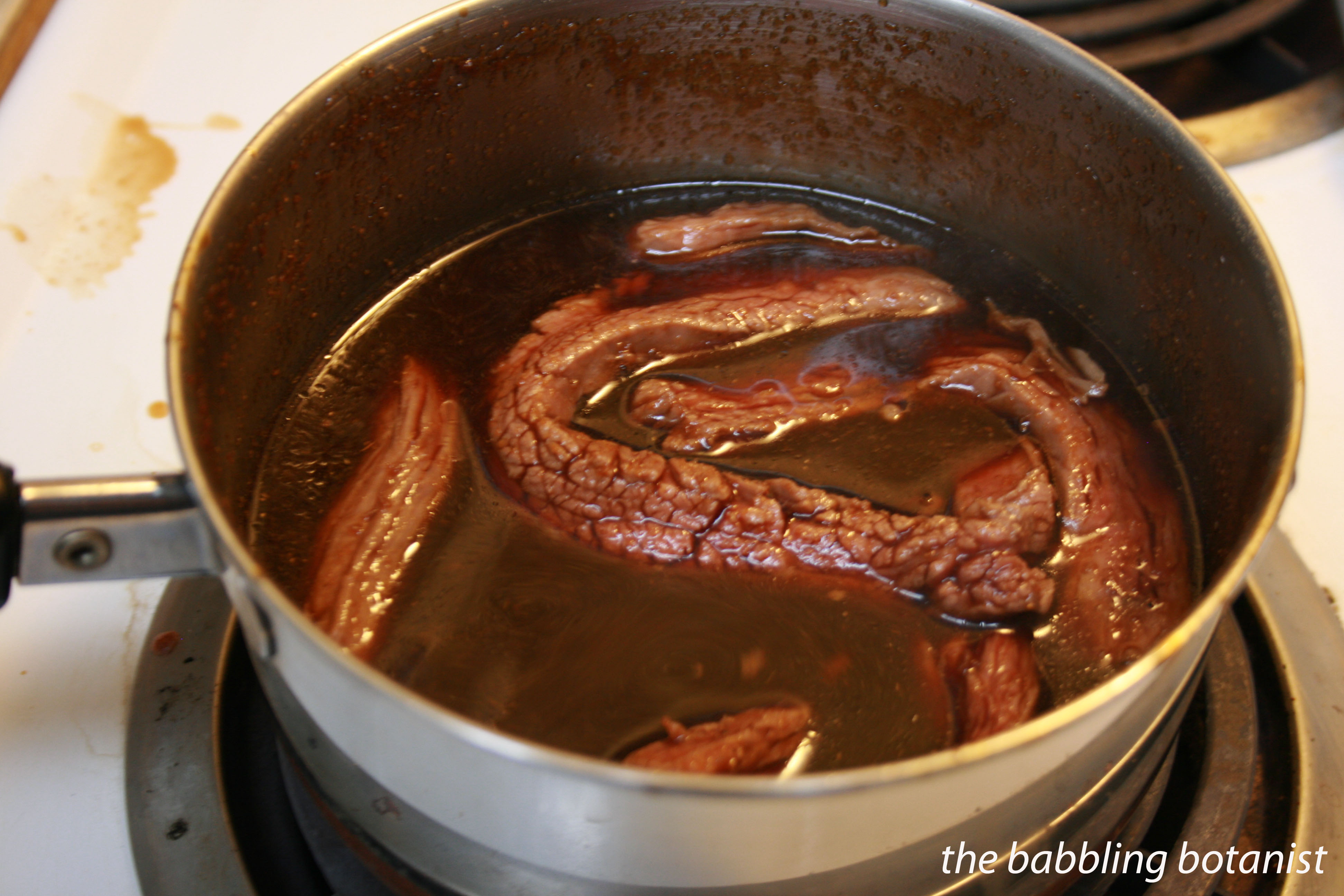 For the third option, do not marinate the meat. Instead, heat the marinade to boiling and add the beef strips a few at a time. Allow the marinade to return to a gentle boil and stir for about two minutes. Remove and repeat until all meat has been precooked, then immediately dry the meat. This precook method also has the advantage of a shorter dry time, and it was actually my MFP teacher’s favourite method, but I find it doesn’t have quite as strong a flavour as the marinade methods, and makes the meat a bit crumbly. But again, try all three and see what you like.