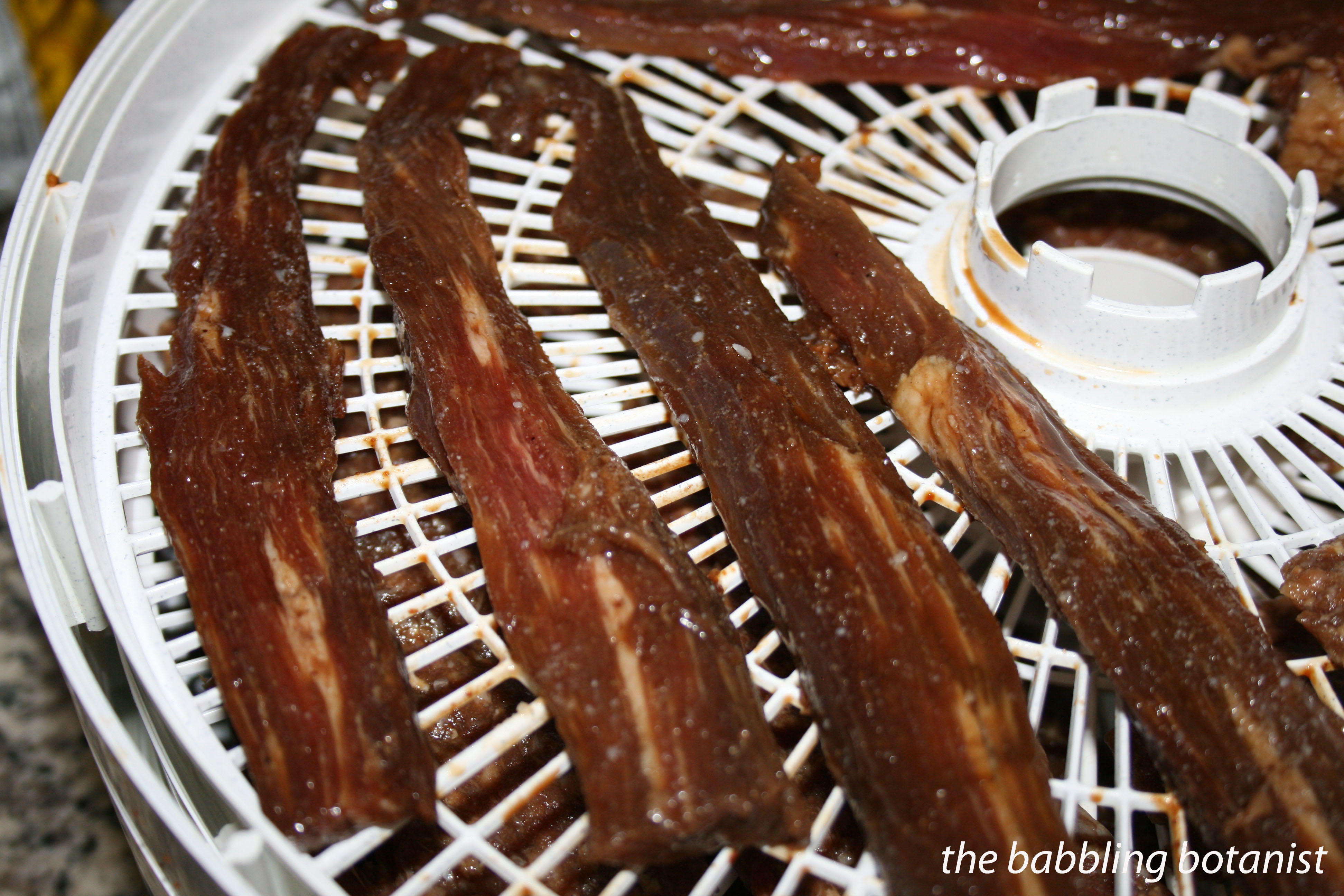 Dry for at least 4 hours (oven drying takes longer and marinated jerky takes longer, and a fuller dehydrator takes longer) until the pieces of meat are dry. When dry, jerky should bend and feel leathery, but not snap. Remove a piece from the dehydrator, let it cool, and then bend it to test for dryness. If there are still moisture pockets, or if you are unsure, dry it a little longer. Most people judge it as done before it really is (including me last time I made this. I had to put them back on the dehydrator and that’s OK).