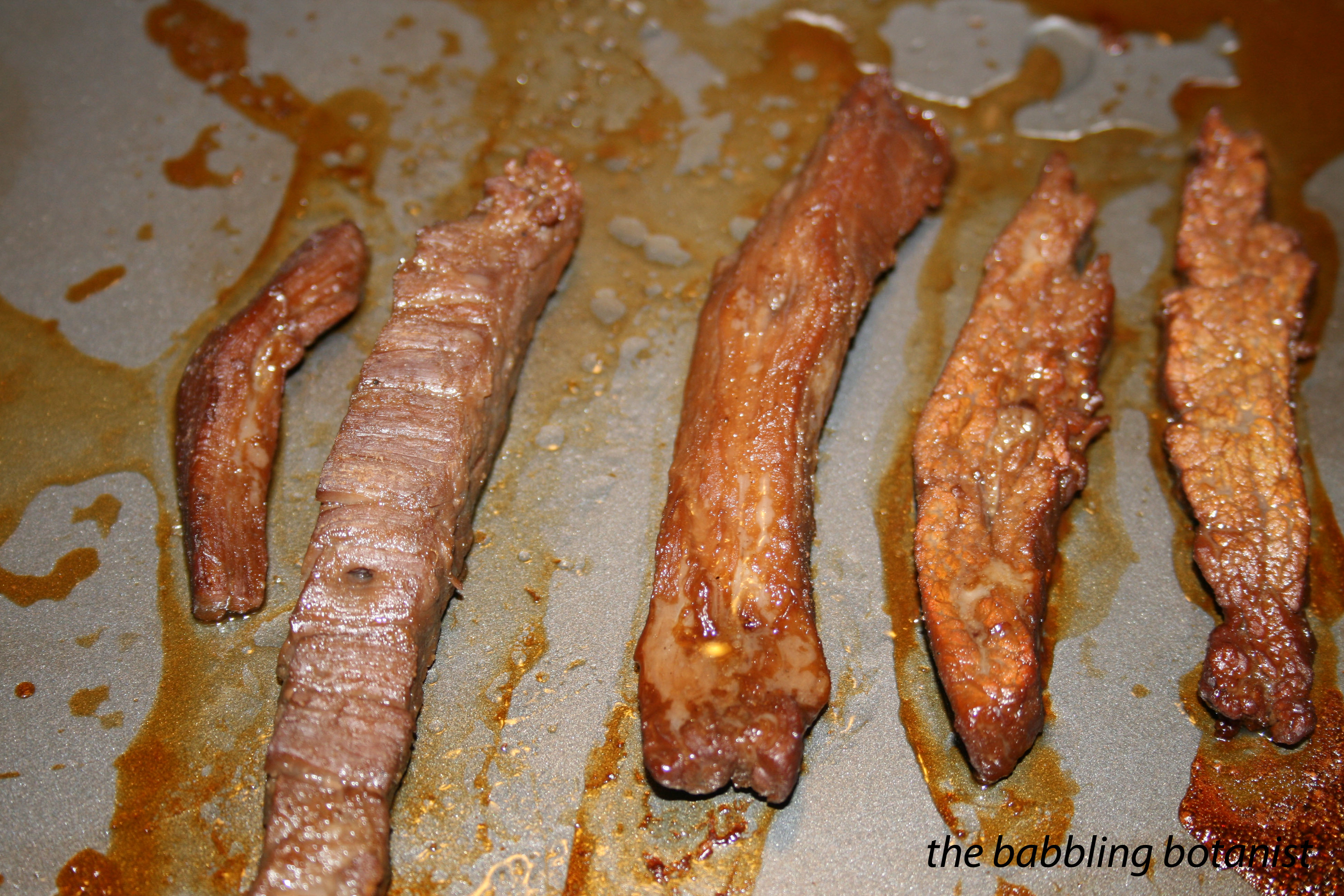 Once the jerky is dry (sorry, the flash totally makes them still look wet), you’ll transfer them to a baking sheet and heat for 10 minutes in an oven preheated to 275°F. At this point your jerky is done. Cool it on a paper towel to absorb any excess fat and then store.