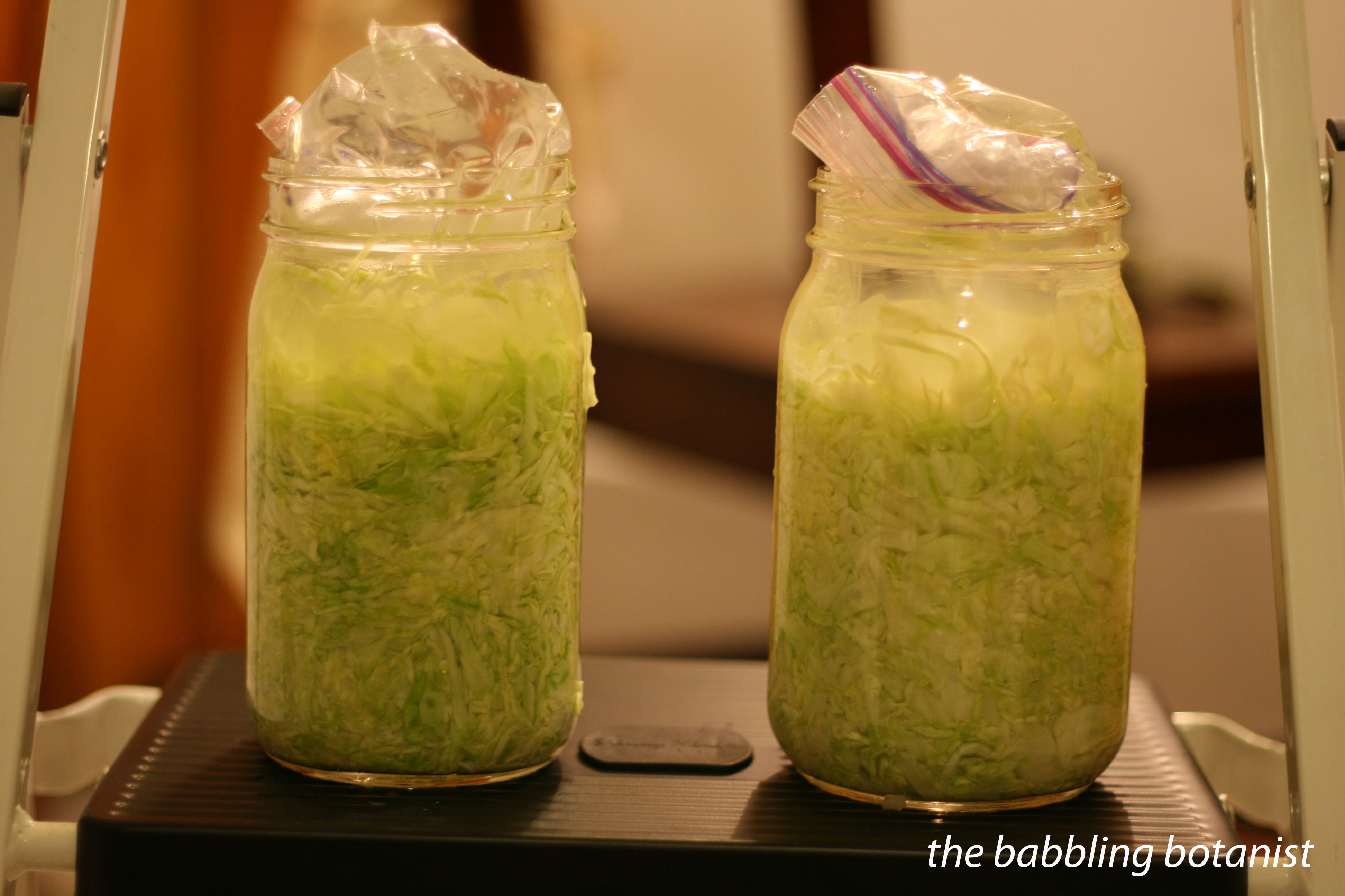 The thing that I liked about doing it in the jars was what we did next. We filled a plastic bag with the brine, and placed that in the top of the jar to hold the cabbage down. With the crock you need to weight it down with a plate or something, and it just seemed a little more difficult. The bag trick totally rocks. If you start to get a bit of scum, just remove the bag, wash it, clean out the scum, and put it back in. It seemed to me like you got a lot less though too with this bag method. Ball says you’ll have to skim it daily, and like this that is definitely not the case.