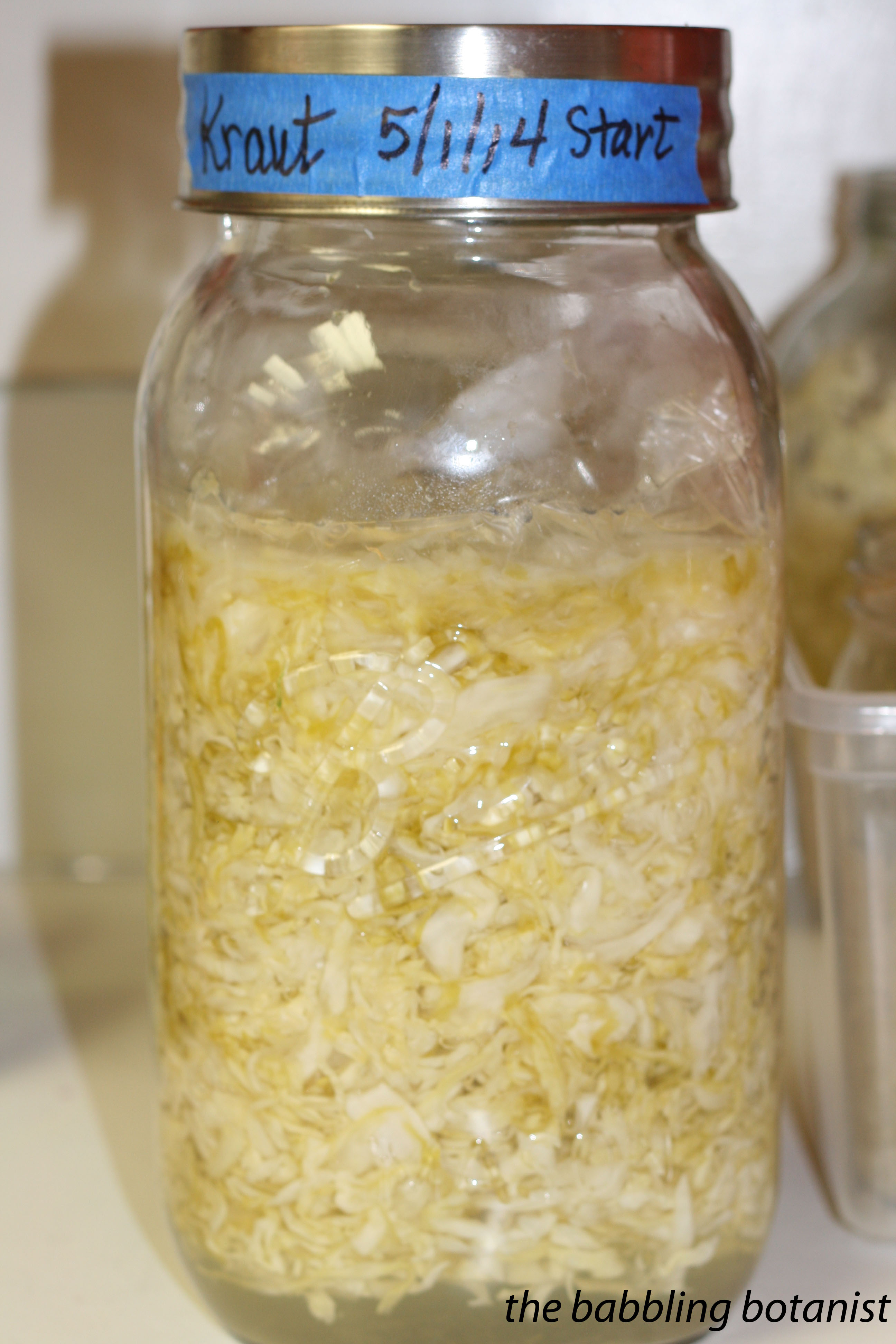 Next you want to transfer it into the container you plan to ferment it in. In class, and when I made it at home later, we just used large mason jars. I think this is easier than a pickling crock, but it’s up to you. The crock is of course nice for a gigantic batch. Push the cabbage tightly into the jar or crock, getting it to release more liquids. It should release enough that you don’t need added brine, but if you do, top it off with a brine that is 4.5 teaspoons of salt for every 4 cups of water. Leave at least 4-5 inches of headspace in your pickling vessel.