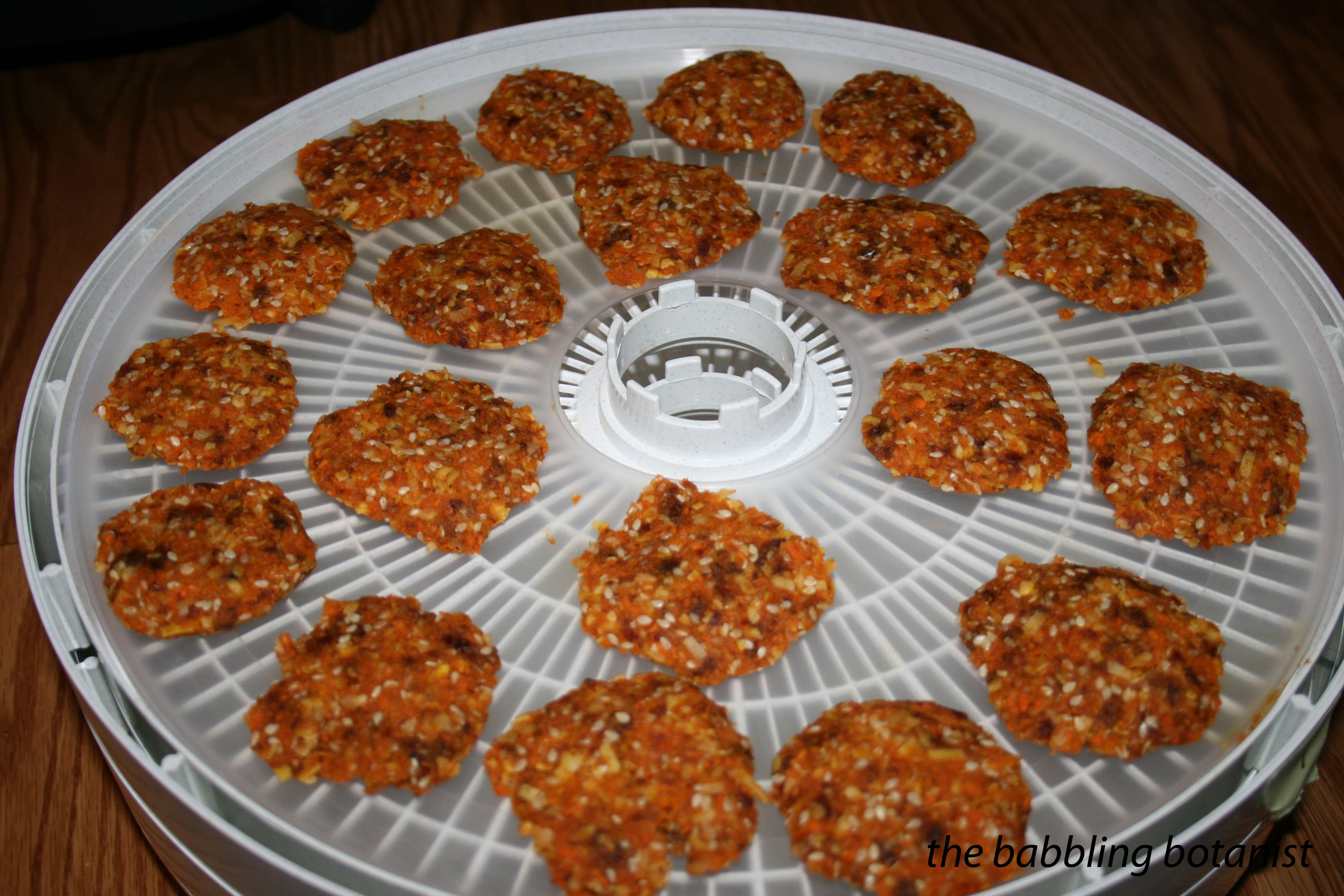 My go to field snack is always granola bars, so last summer I was trying to mix things up and I discovered these delicious Go Raw cookies. They are tasty tasty! And pretty good for you – sprouted sesame seeds, carrots, coconut, dates and no added sugar. However, they are absurdly expensive, so I decided to try and make them myself. I finally got around to it last week when I harvested a bunch of carrots. They only have 5 ingredients, so I figured I could clone the recipe pretty easily. Here is what I came up with!