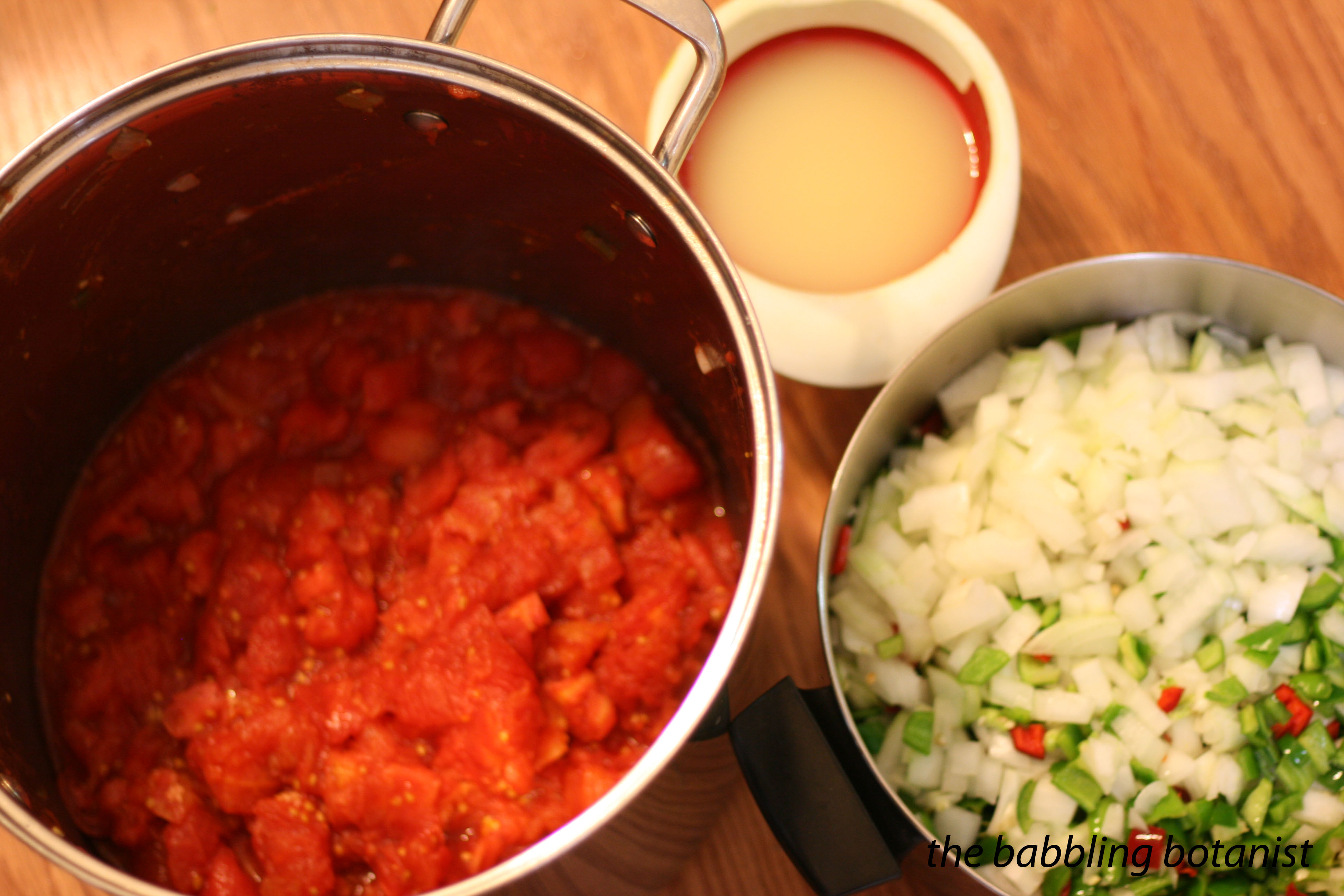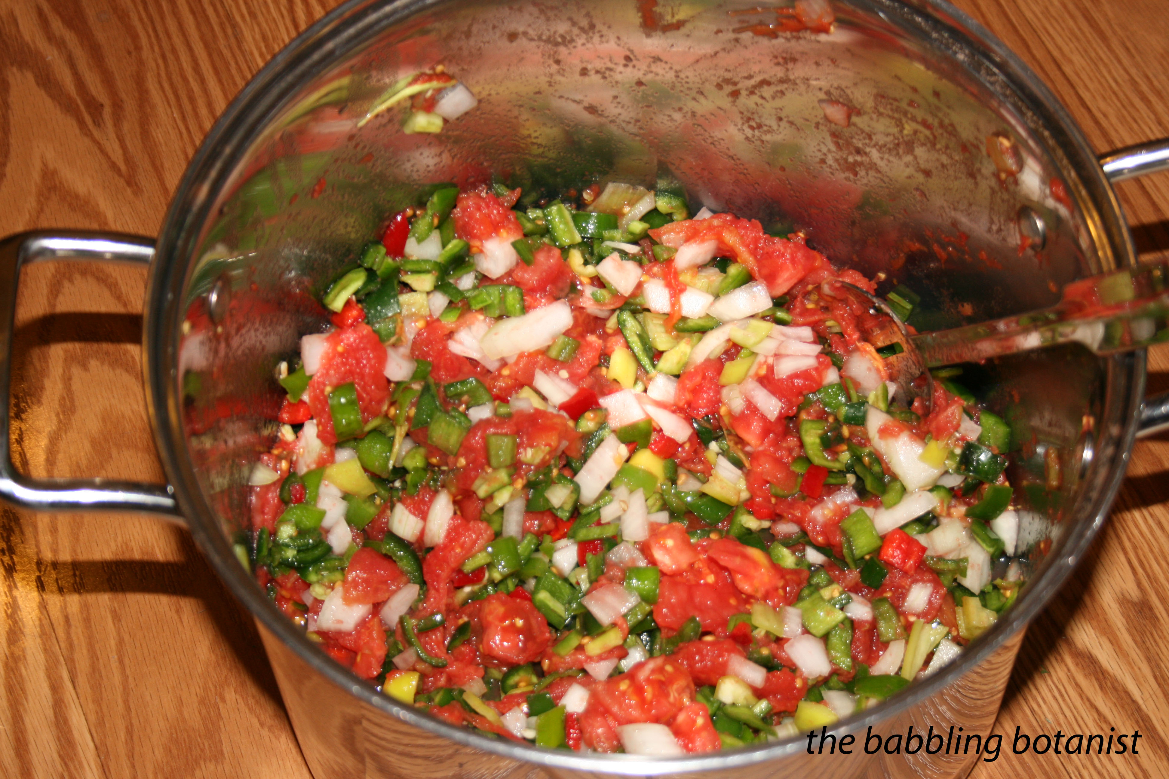 Blanch, peel and chop your tomatoes. My favourite way to deal with all the tomatoes is to core them, dip them in boiling water for 30 or so seconds, dip them in ice water, peel and chop them. Next chop up all the onions and peppers – you choose how much! But it has to total to 9 cups of onions and peppers, for 6 cups of tomatoes. This worked out really well for us because we made a big batch of Chile salsa, and then with the remaining tomatoes we made the choice salsa. It worked out well because I always have trouble buying the correct amount of peppers for a recipe. I grow my tomatoes, but buy the peppers and onions, so when I have 40 pounds of tomatoes, I have to figure out the right number of peppers to buy. This is HARD. So it worked super well that we used up all the rest of the peppers we had, then topped it off with the onions, since if you buy extra onions they store way better than peppers! So great! We ended up with a recipe fairly heavy on the peppers, but I think it turned out really well. I do find the lemon juice flavour to be quite strong though, so I think next time I might try half lemon, half lime.