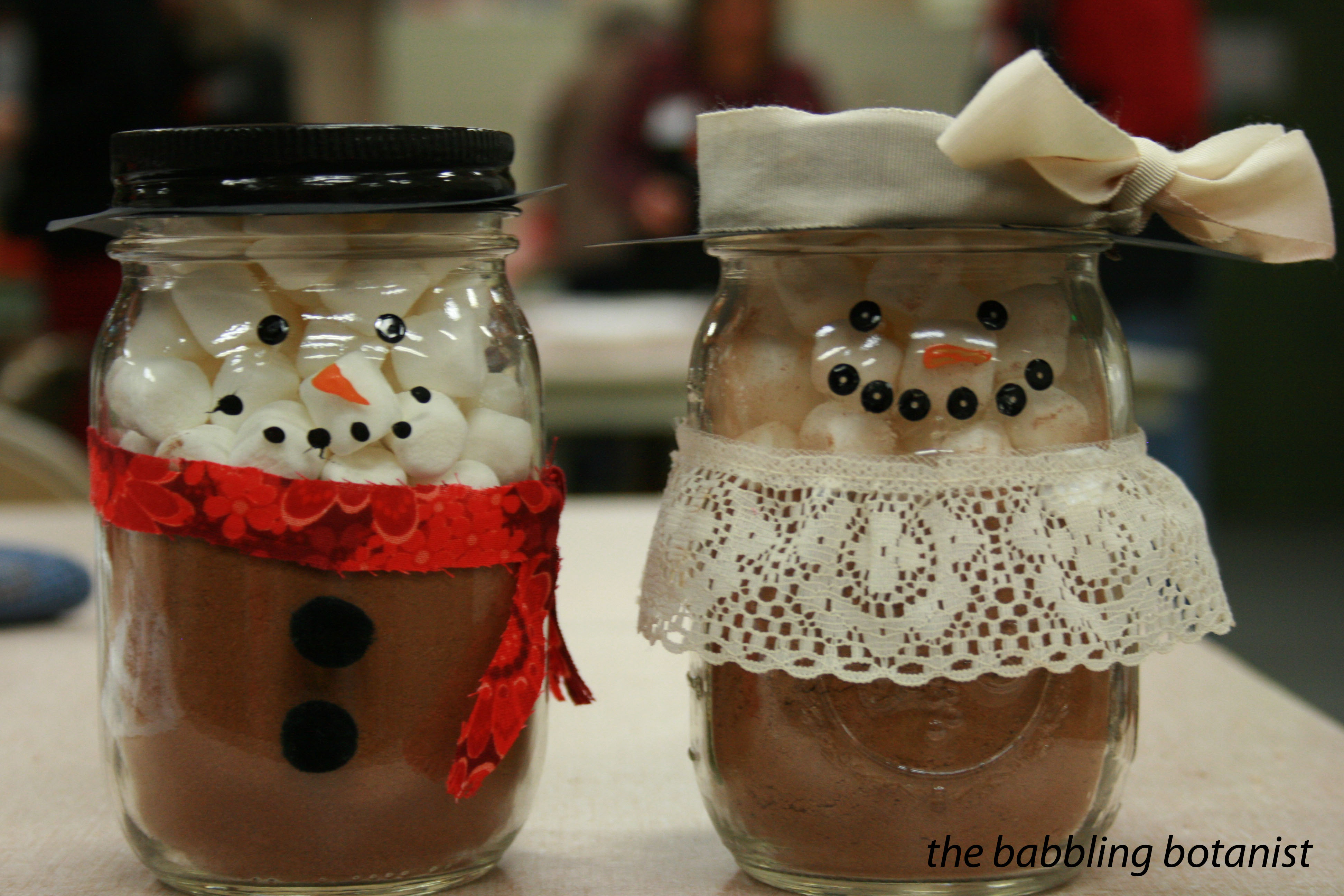 I did mine as a snowman (the guy on the left). I got this idea from my nana, who made them a number of years ago for Christmas gifts, but I made mine a little differently, using just one canning jar. All I did for mine was mix 1 part cocoa powder to 2 parts sugar, but you can also follow other recipes with dried milk in them as well. The one we did in class was 1/2 cup cocoa powder, 1/2 cup dried milk, 1/2 cup sugar, pinch of salt, 1/4 cup chocolate chips and 1/4 cup (or to fill the jar) mini marshmallows. Then, make a head out of marshmallows and decorate the jar with a scarf, face and hat made of cut out construction paper and a painted band and lid. Adorable. One of the girls in the class made this girl snowman who became buddies with mine.
