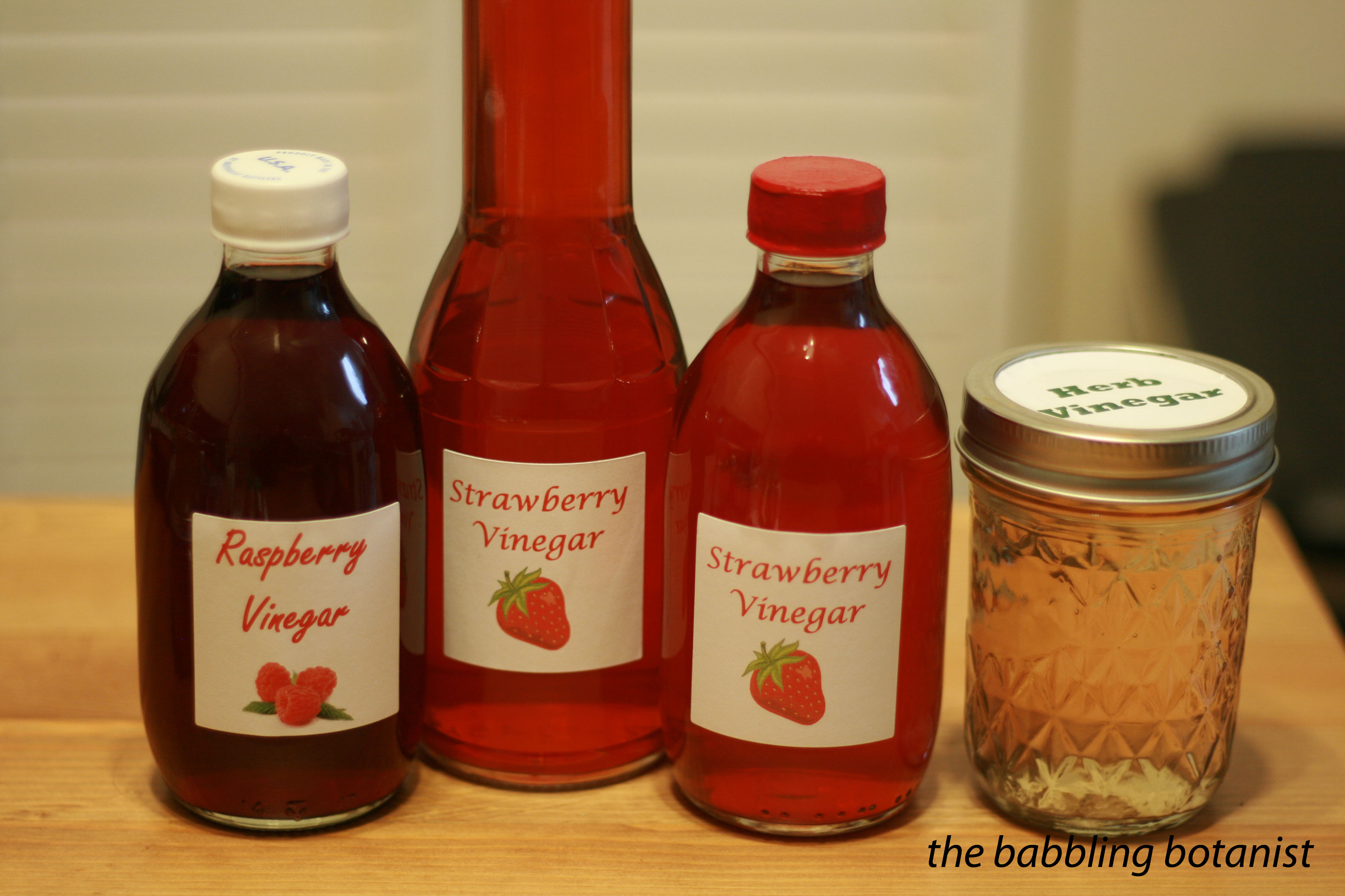 Leave your vinegar alone for at least a couple of weeks. Three or four weeks is enough to achieve a nice flavour, but longer isn’t going to hurt anything. I made my strawberry one in May and didn’t get around to straining it until November. It’s dang delicious. Basically you can strain it whenever you taste it and are happy with the flavour. If it gets too strong, simply dilute it down with more of the vinegar you had used to make it in the first place.