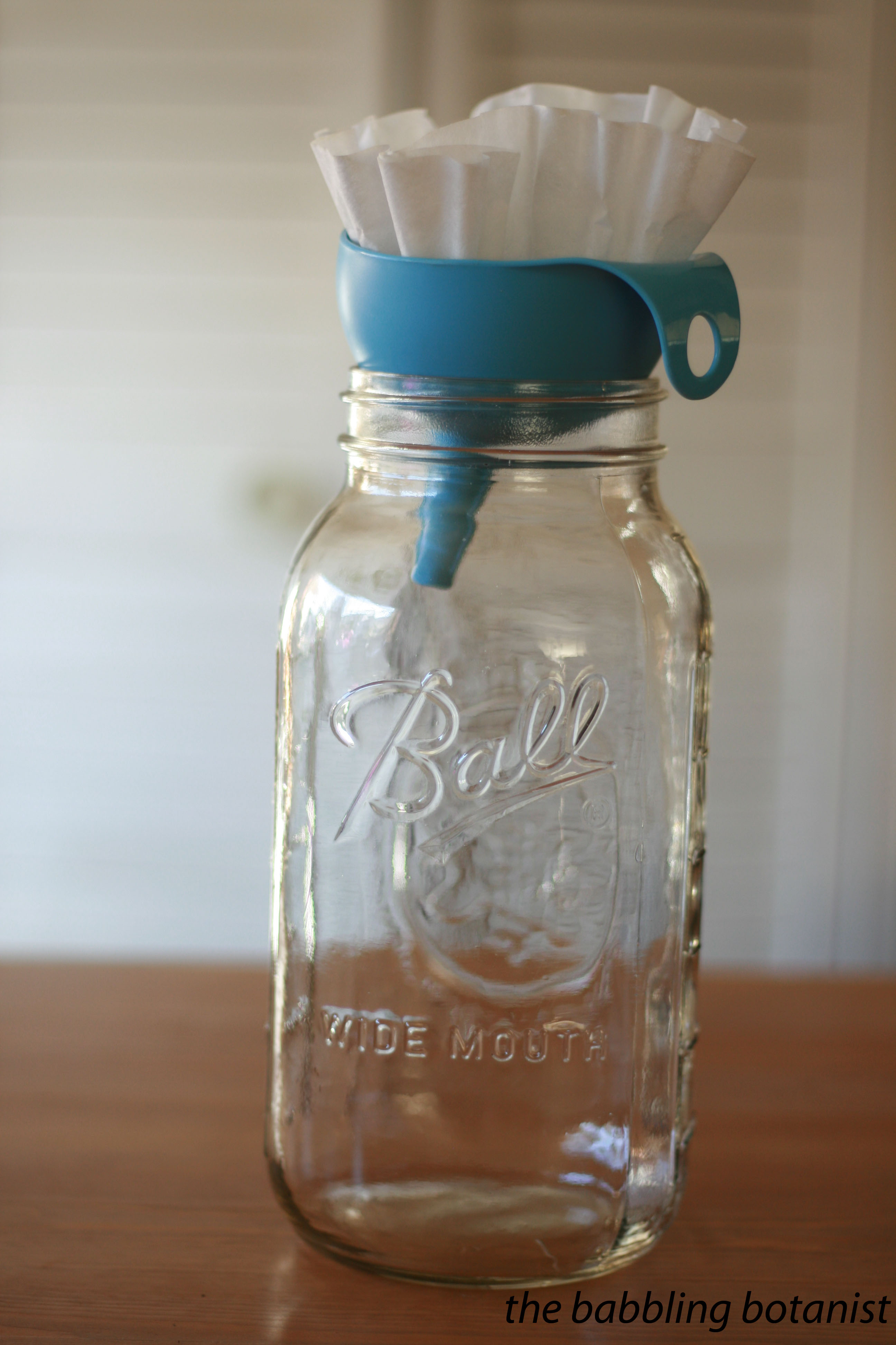 When it’s time to strain, sterilize a jar of the same size that you have your vinegar in, place a funnel in the jar, and add a coffee filter or cheesecloth. Pour the vinegar into the filter.