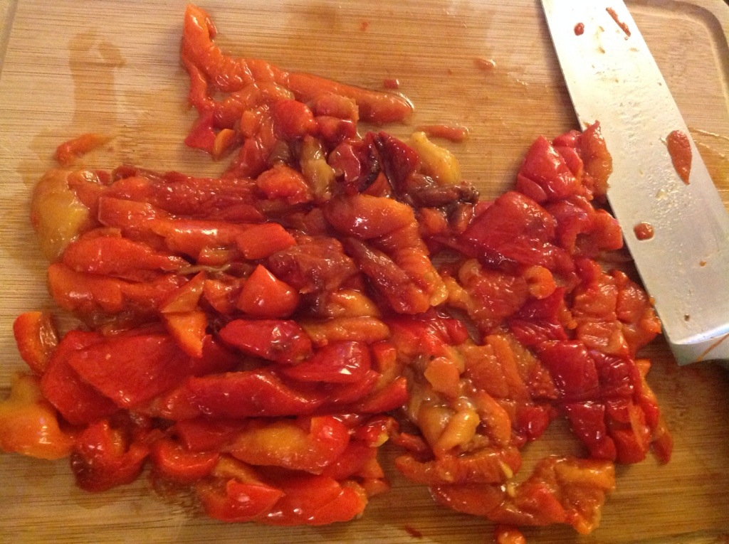 Peel the skins off the peppers once they cool enough to handle. Some slide right off but some are a terrible pain. My advice would be to try and grab it by a blister and pull off as much in one go as possible. Chop the peppers and add to the pot with the tomatoes. You can also pour some of the juices released from the tomatoes and peppers on the tray into the pot.