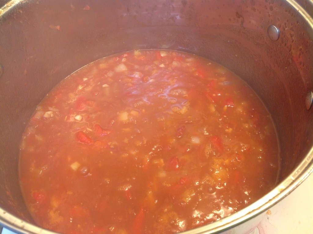 Look at those beauties! Let them cool enough to handle them, peel off the skins and put the tomatoes in your pot. You can chop them coarsely if you like but mine fell apart so easily I really didn’t need to do any chopping.