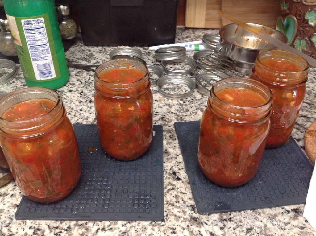 After the 35 minutes is up, turn off the heat, remove canner lid and wait 5 minutes before removing the jars to a hot pad or towel. Wait 12-24 hours for them to cool. Check seals, wipe down the jars, label and store.