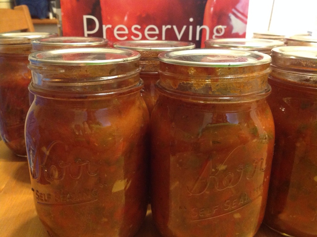 OK so as promised, here is my safety rant… I mean discussion… about this sauce. As you may notice, there are a LOT of low acid ingredients in this recipe. There is a 2:1 ratio of tomatoes to peppers, and onions on top of that. So, since I really want to be safe in my canning and not make anyone sick, I wanted to check into whether this is acidic enough. My one big reminder here is this: anyone can publish a book/blog/whatever about canning, so always do your research before making a new recipe. Ball for example can be trusted, and so can other books that have actual tested recipes, such as this one, by a university extension service or the USDA. I was a bit wary as to whether this recipe is acidic enough for hot water bath canning, so I referred to some ball ratios to help me decide. I found a salsa recipe that has very similar ratios of tomatoes, peppers and onions. Per tomato amount it has slightly less peppers than this recipe and slightly more onion. When scaled to the quantity of this sauce, it has about 2-3 tablespoons more acid than this recipe, and around a cup more low acid ingredients (onion and pepper). So basically what I am saying here is the recipe seems to be pretty darn close to a trusted recipe I have. And really, all I am saying is stay safe! Definitely do not add more onions or peppers to this recipe! And if you are worried at all, as I was, add a little more acid. I tried a little more lemon juice and think you may start to taste that, but I think upping the vinegar to 2/3 cup would not change the flavour too much, or you could also reduce the peppers or onions a little. All in all I just wanted to remind people not to trust every recipe you see unless they are tested recipes and feel free to be extra safe with a little added acid. OK rant done, now go make some sauce it’s so delicious!