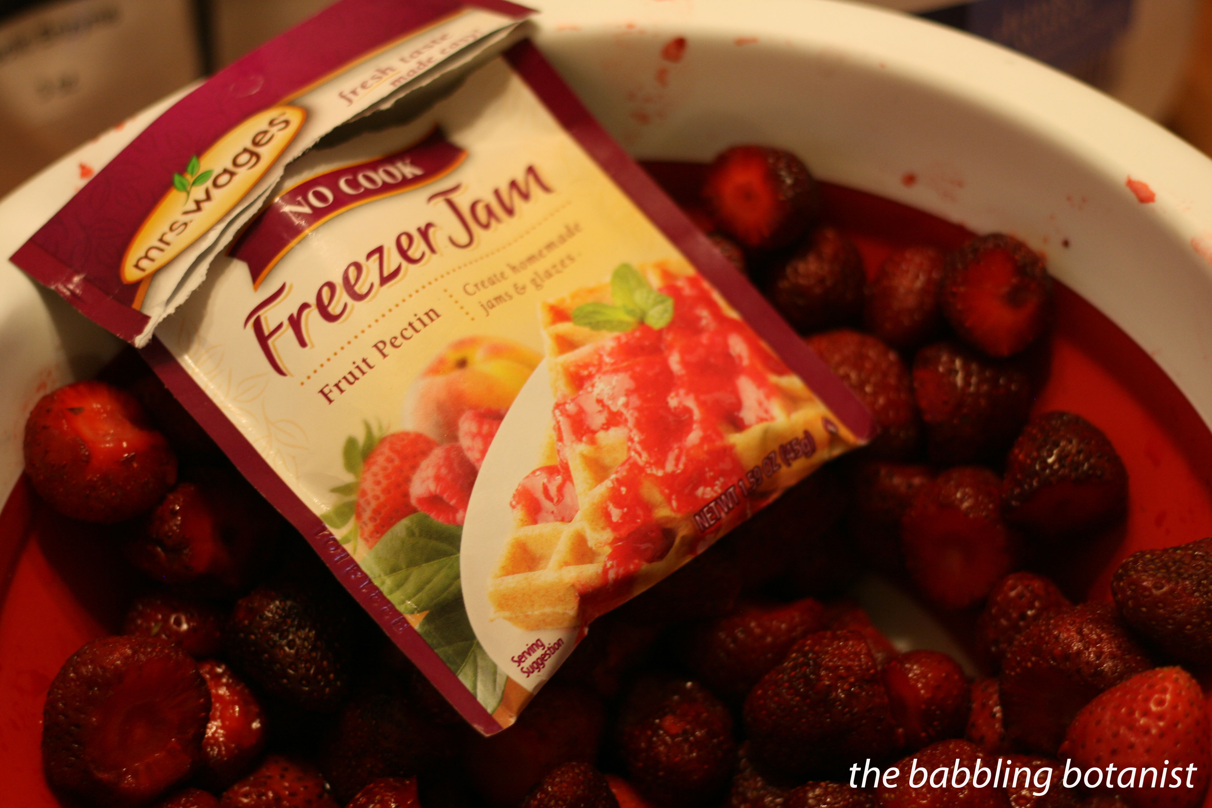 For this endeavor I used Mrs. Wages freezer jam pectin, but Ball and many other brands also make freezer jam pectin.