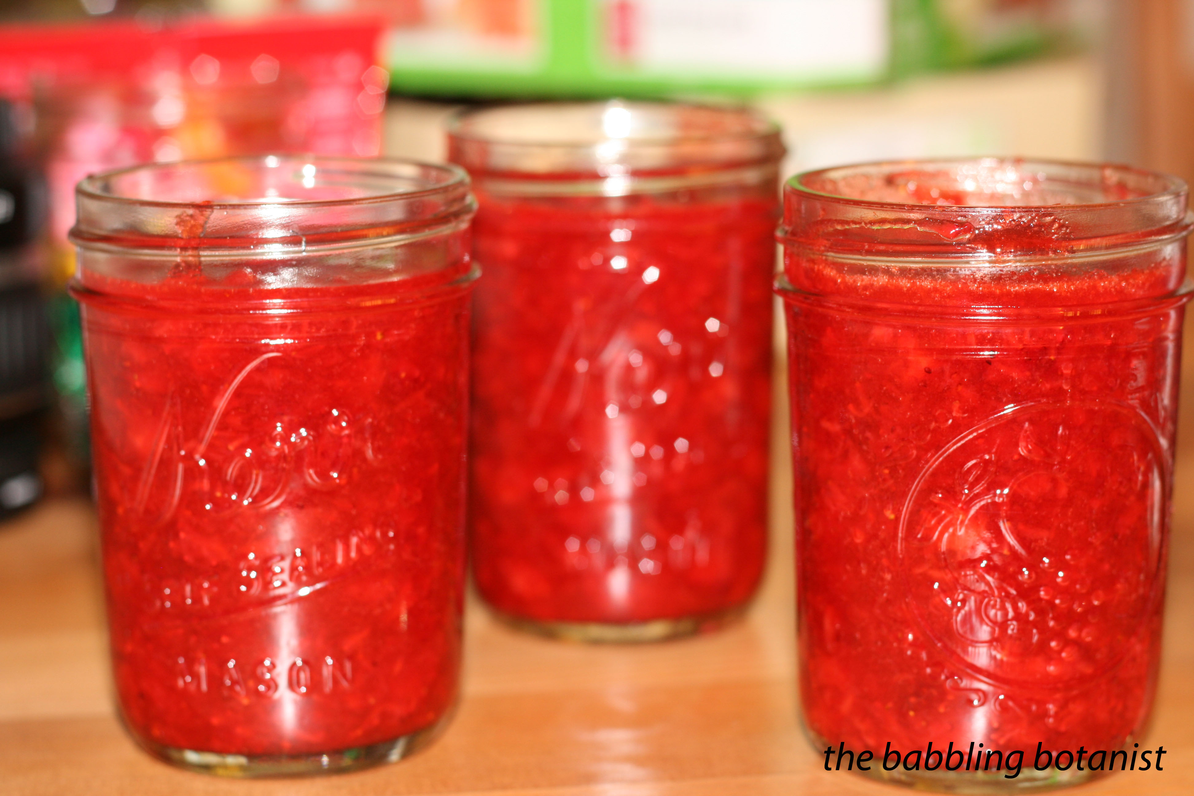Now all you do is pour it in jars. Leave a half inch or so of head space for the jam to expand when it freezes. Put on the lids and bands. Let it set up at room temperature for a half hour or so prior to freezing it.  You can leave it longer if you want, just not longer than 24 hours. After that just pop it into the fridge or freezer. It will keep around 3 weeks in the refrigerator or a year in the freezer.
