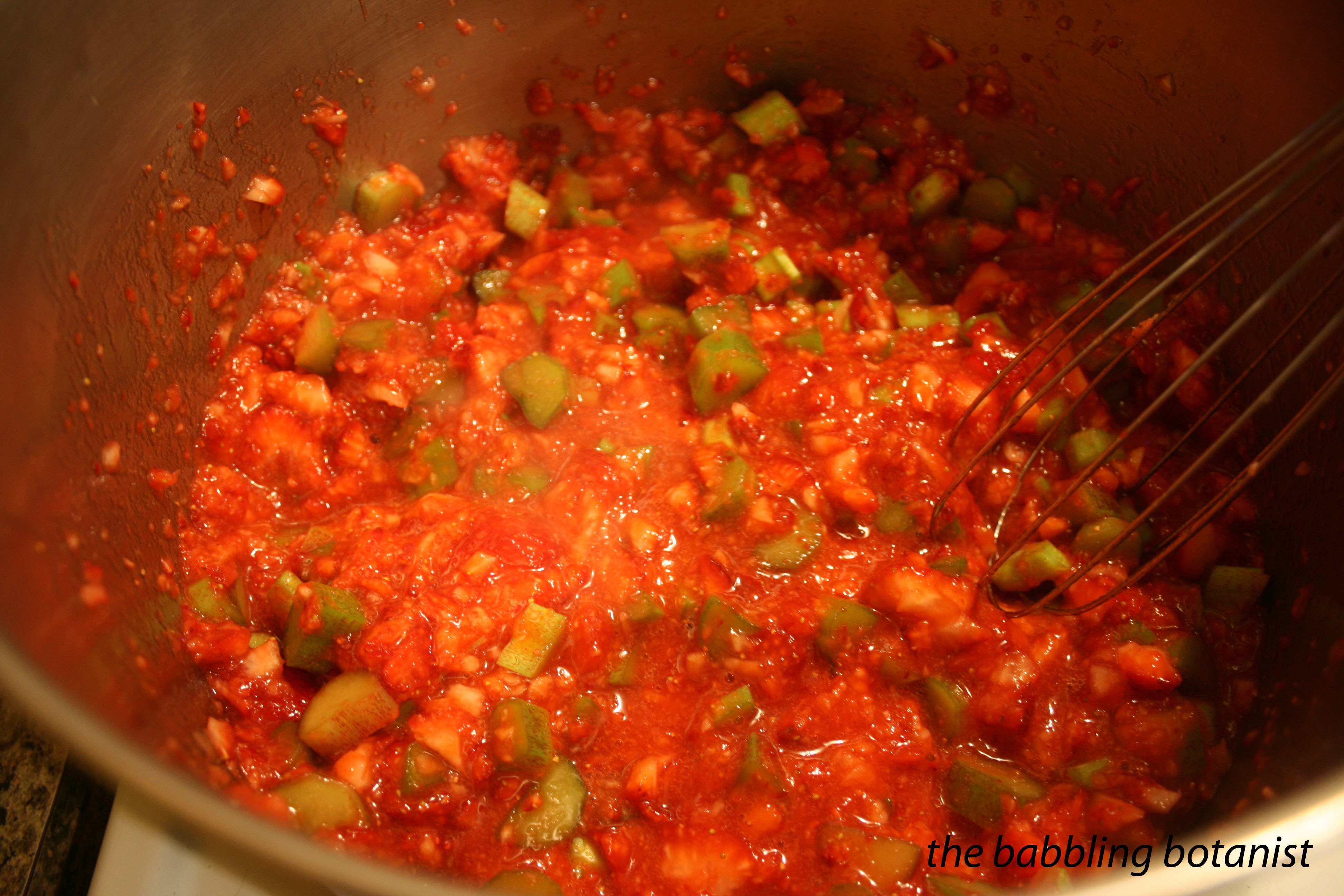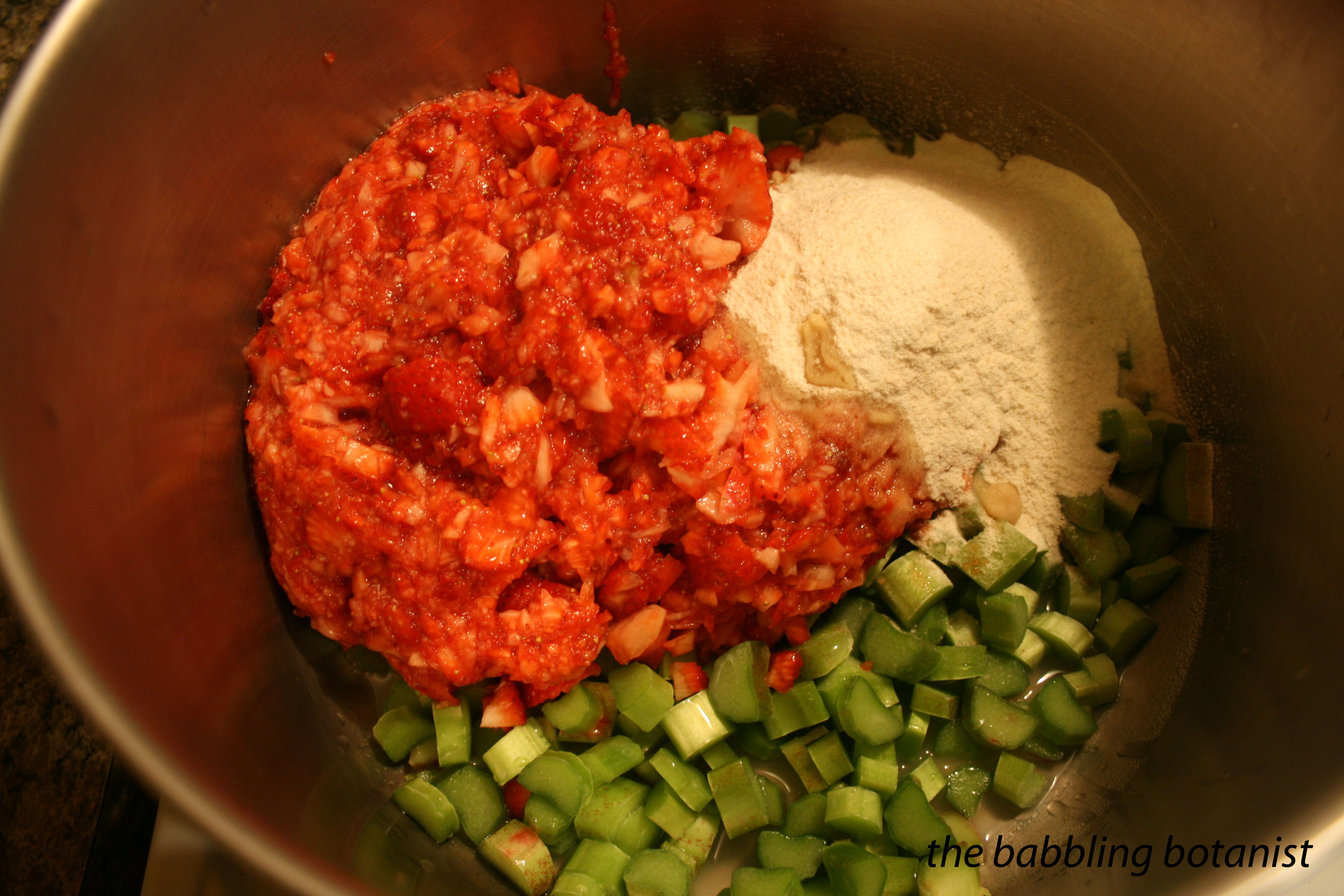 Mix together the crushed strawberries, rhubarb, pectin, and lemon juice in a deep stainless steel saucepan. Measure out the sugar and set it aside so it can be added all at once.