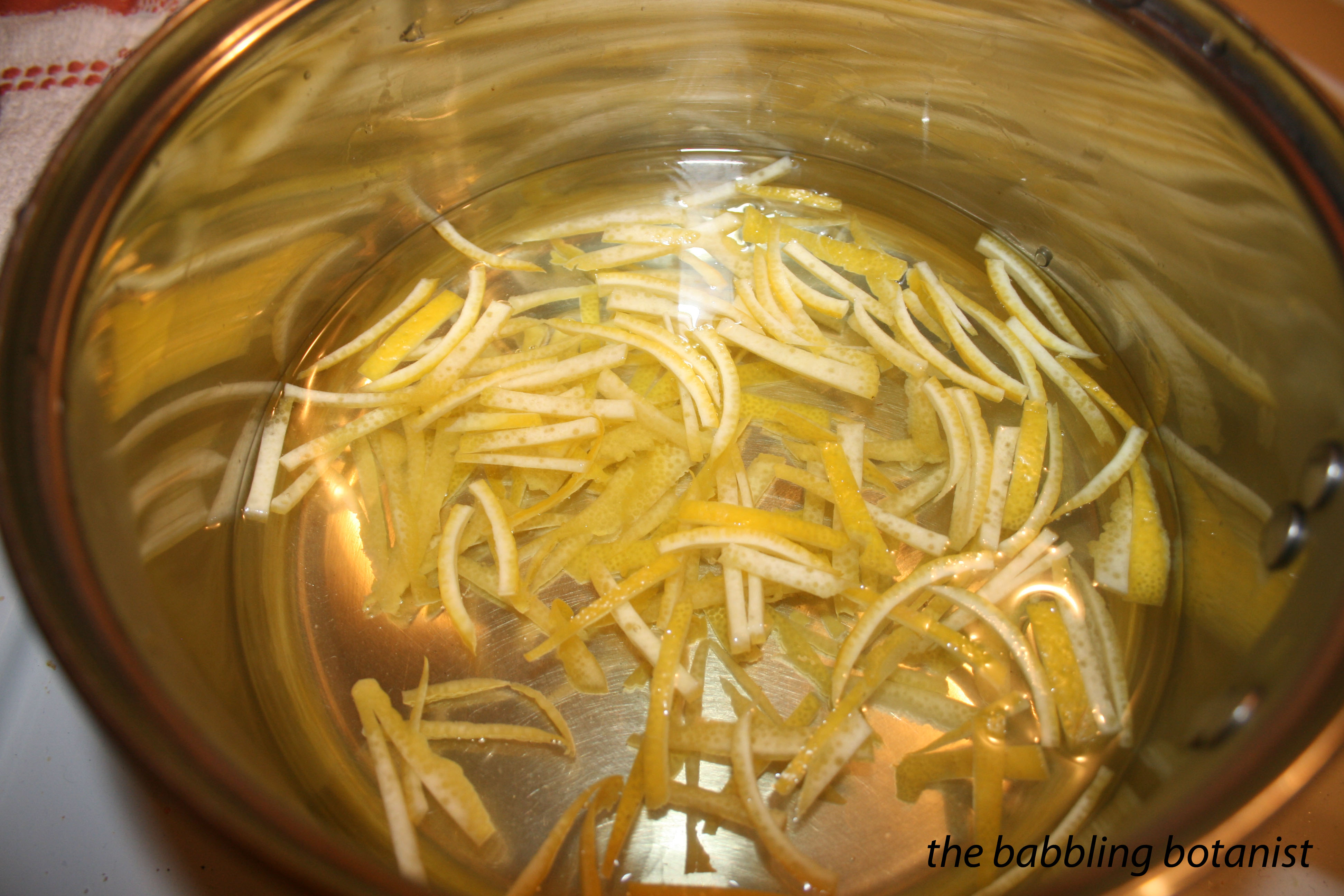 Since this is a quick recipe (some may read “quick” as “cheating” 😉 ) with pectin it doesn’t boil for hours like traditional marmalade, which is what softens up the bits of citrus peel. So step one here is to cut the lemon peel into thin slices and boil it in water for 5 or so minute to soften it a bit. Meanwhile prepare the canner, jars and lids. This makes about 7-8 half pints.