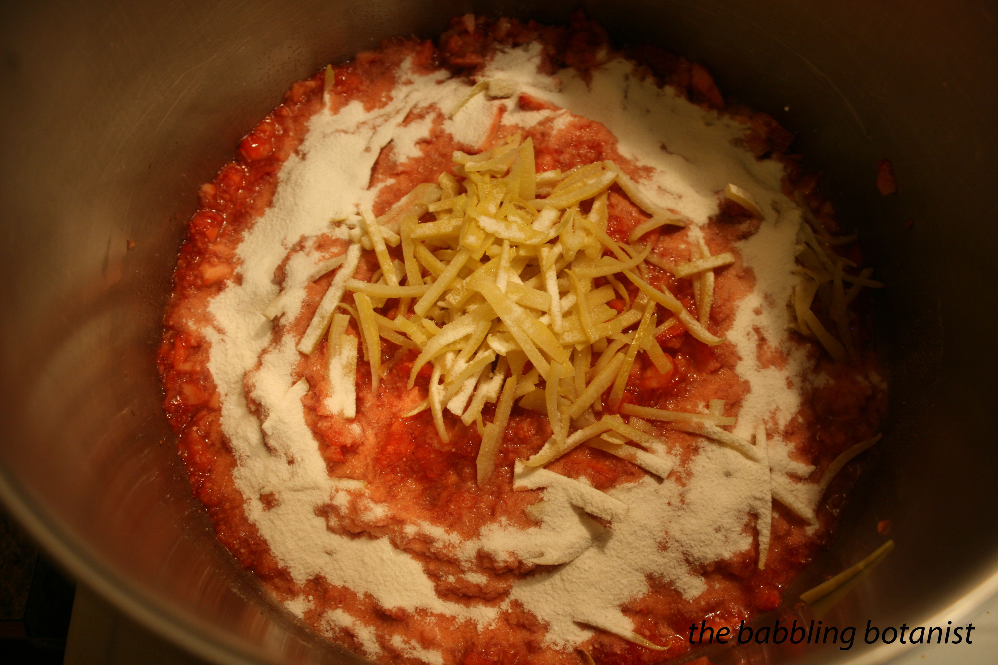Then the liquid gets discarded, and you combine the peel bits with the strawberry mash, lemon juice and pectin. I ended up squirting in some additional lemon juice, partially for the shock factor because the other ladies weren’t expecting it, but I also think it gave it a nice extra zing!