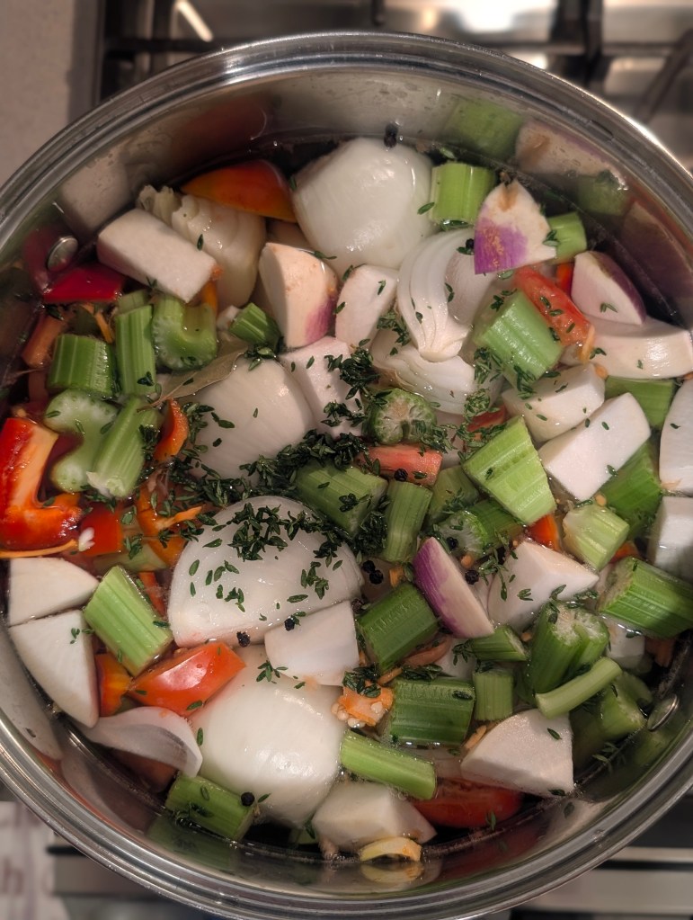 Wash your veggies. Peel and coarsely chop the onions, peel and crush the garlic, and chop up the rest of the vegetables. Combine everything with the water in a large stockpot. Bring to a boil, then reduce and boil covered for 2 hours.
