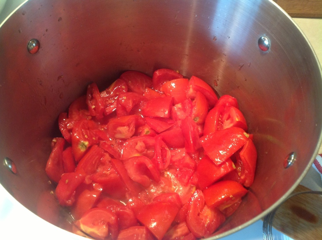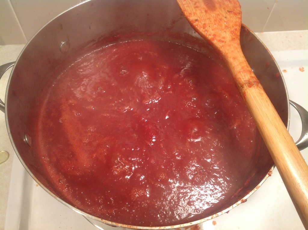 While you prepare the rest of the ingredients you’ll want to get the tomato puree going on the stove so that it will reduce down to make you a nice thick sauce. Add some of it to a large stainless steel pot and bring it to a boil over high heat. Gradually add in more puree, maintaining the boil and stirring constantly, until it’s all in the pot. Continue to boil for at least an hour, or until reduced by about a half. If you are just doing a relaxing session, reduce the heat and let it simmer away for a while. If you want to reduce it faster, you could also divide it up into multiple pots for a while, and recombine it later.