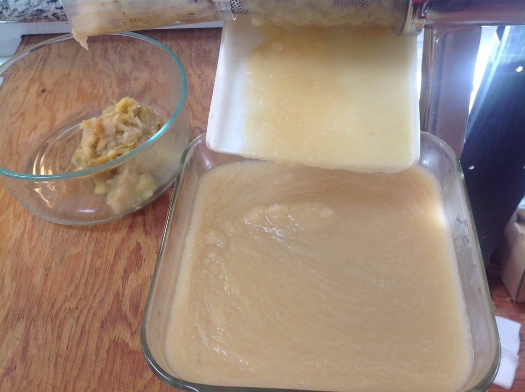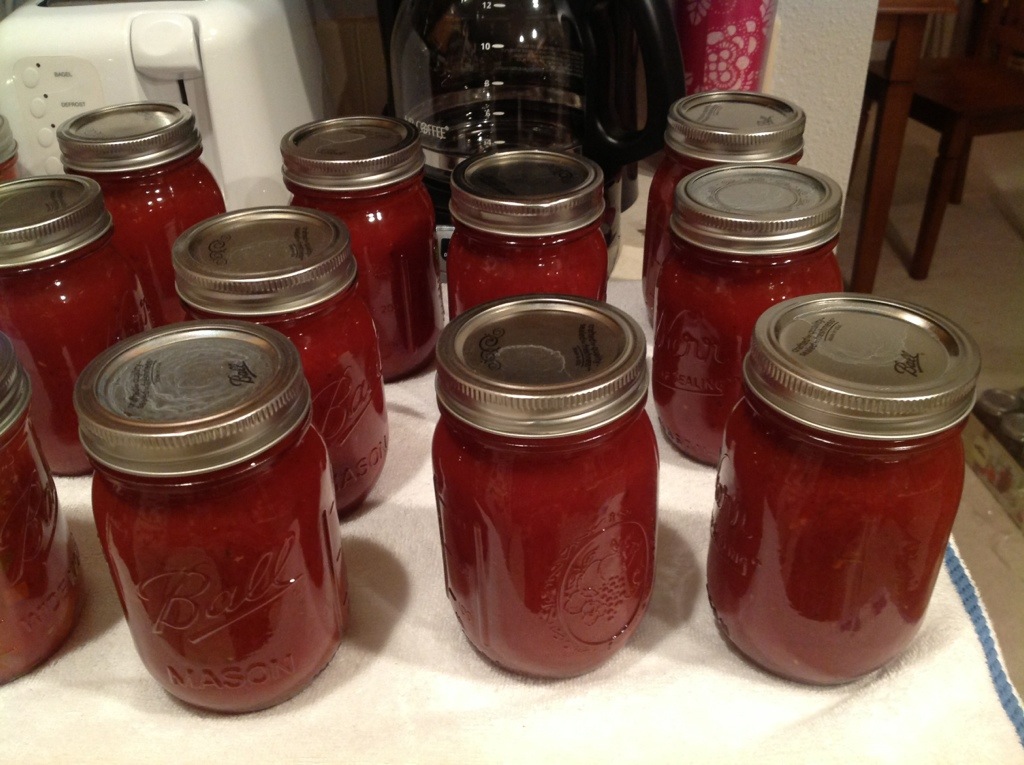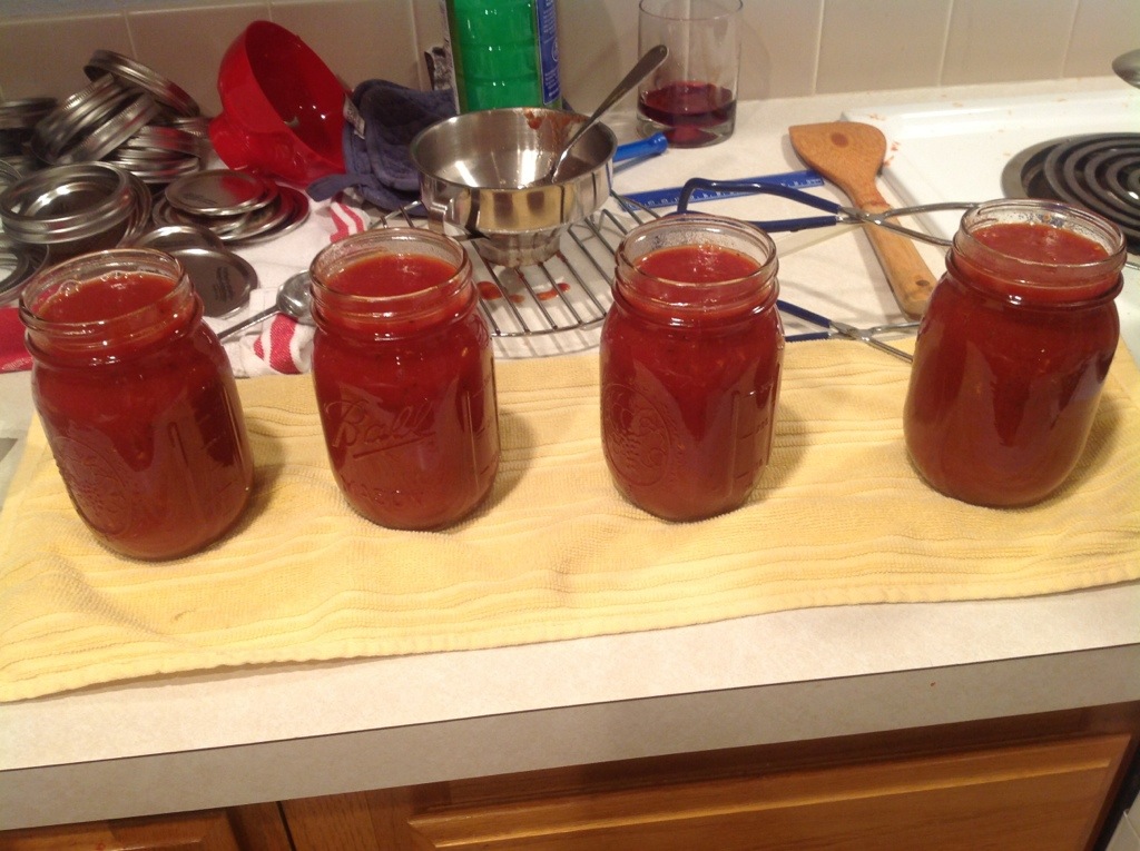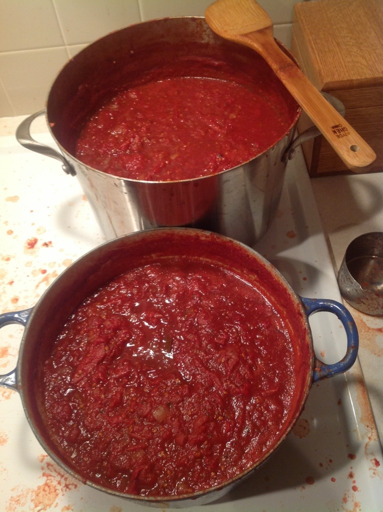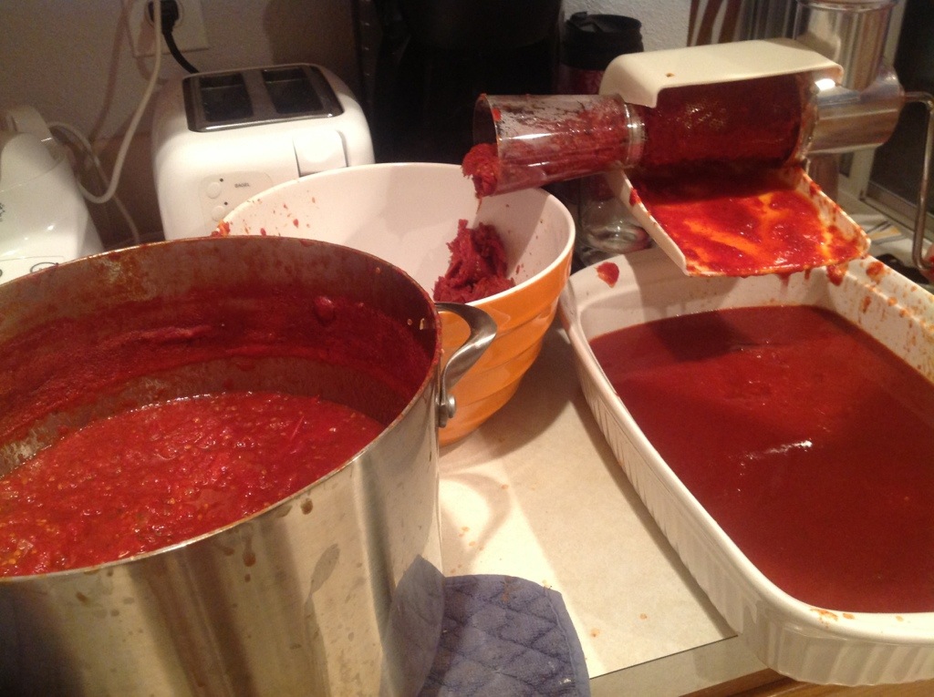 For this endeavor, Kiki had texted me that she had scored some tomatoes for dirt cheap, and asked if would I help her process them. I was thinking she’d probably have a small box we could just add to the sauce I was already making, but she showed up with a giant box that I now wish that I had weighed. We had a TON of puree when we finished, and through some ridiculous canning miracle it was actually almost exactly 32 cups, so we doubled the recipe.