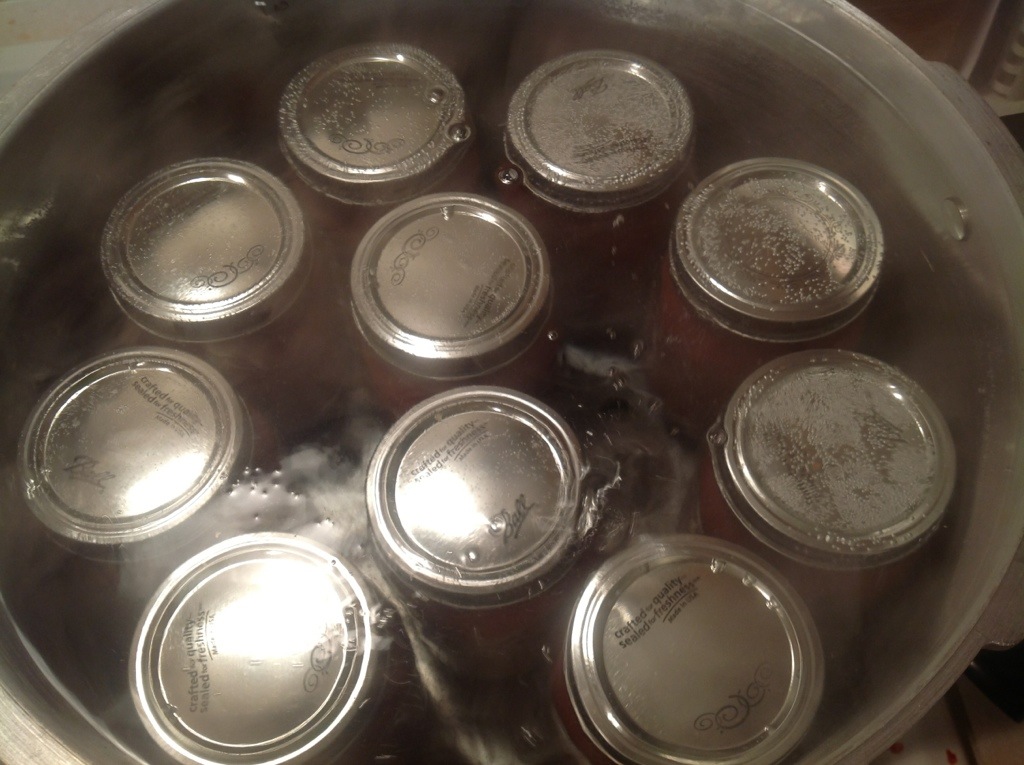 After 20 minutes, turn off heat, remove canner lid, wait 5 minutes and remove jars to a hot pad or towel. Cool 12-24 hours, remove bands, check seals, wipe clean, label and store.